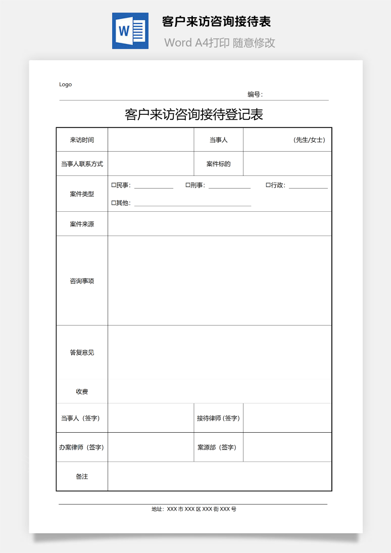 首页 Word模板 律所管理 律所客户来访咨询接待表