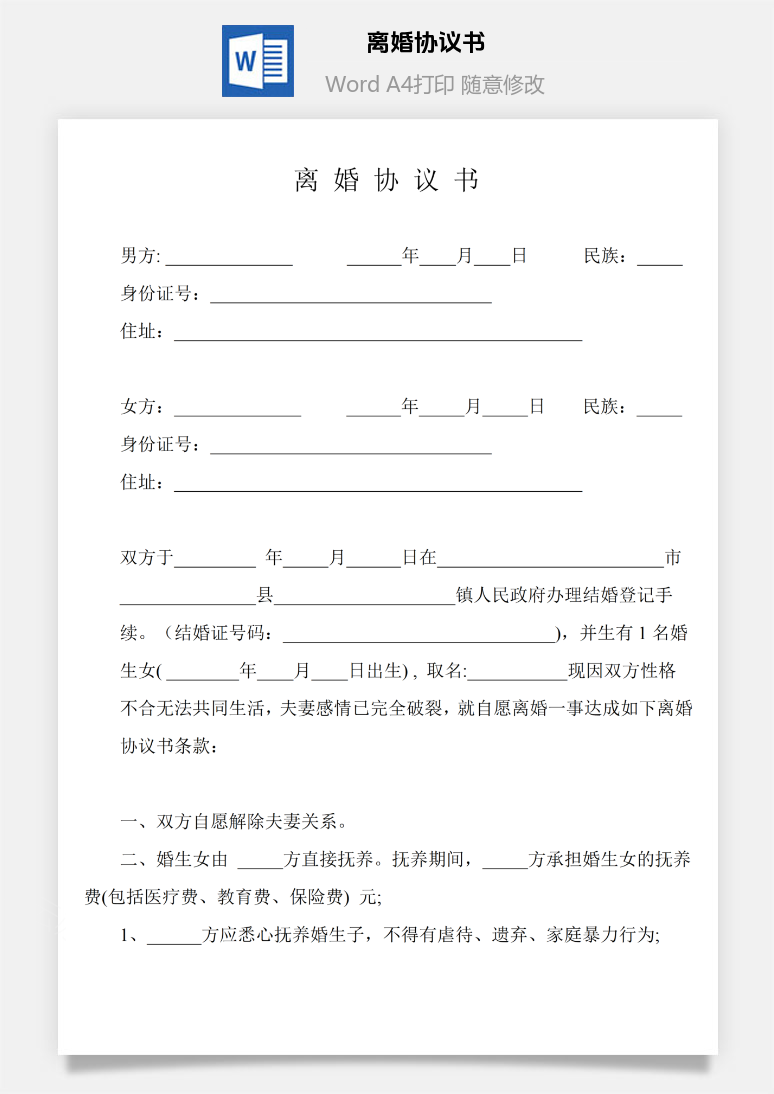 首页 Word模板 合同范本 离婚协议书