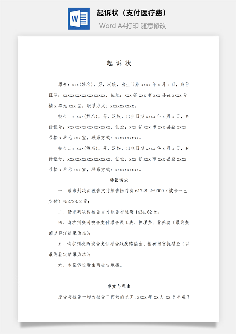 首页 Word模板 民事诉状 民事起诉状(支付医疗费)