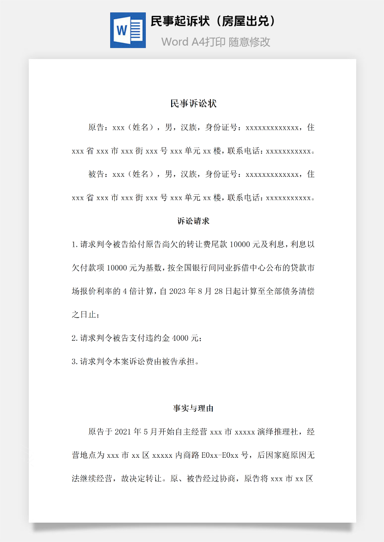 首页 Word模板 民事诉状 民事起诉状(房屋出兑)
