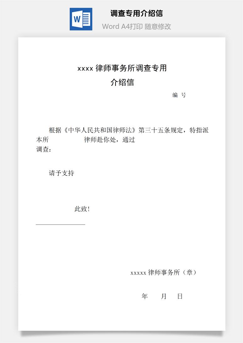 首页 Word模板 律所管理 律师事务所调查专用介绍信