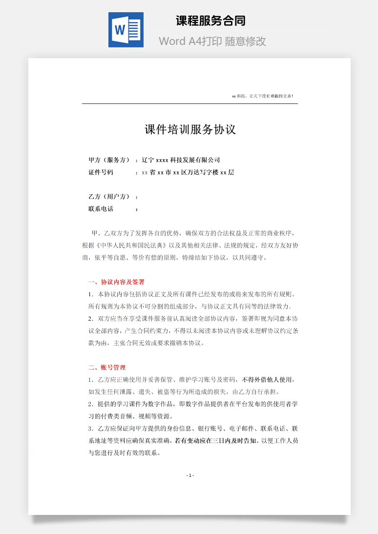 首页 Word模板 合同范本 课程服务合同