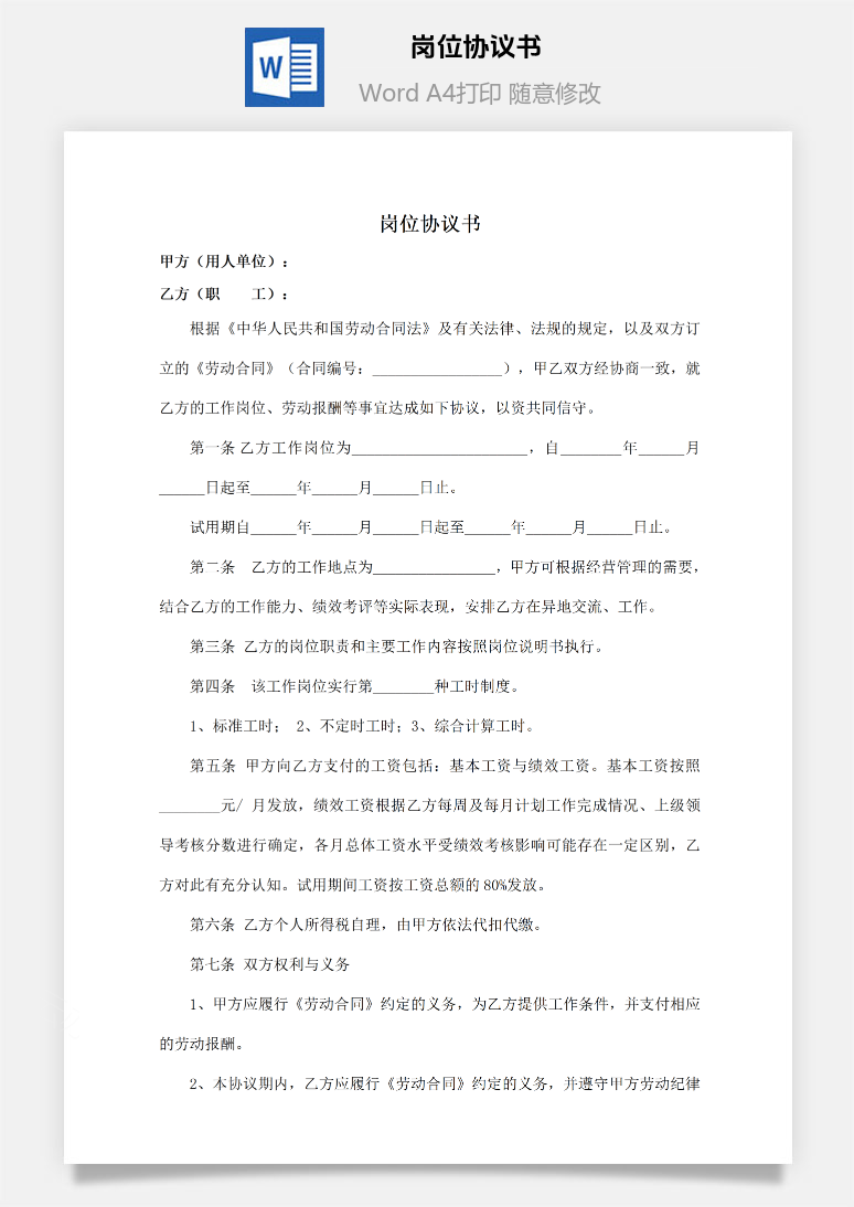 首页 Word模板 人力资源 岗位协议书