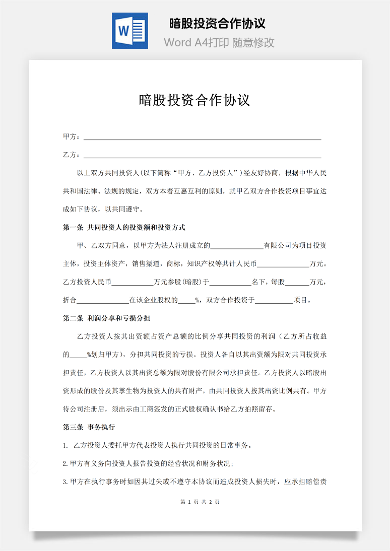 首页 Word模板 合同范本 暗股投资合作协议