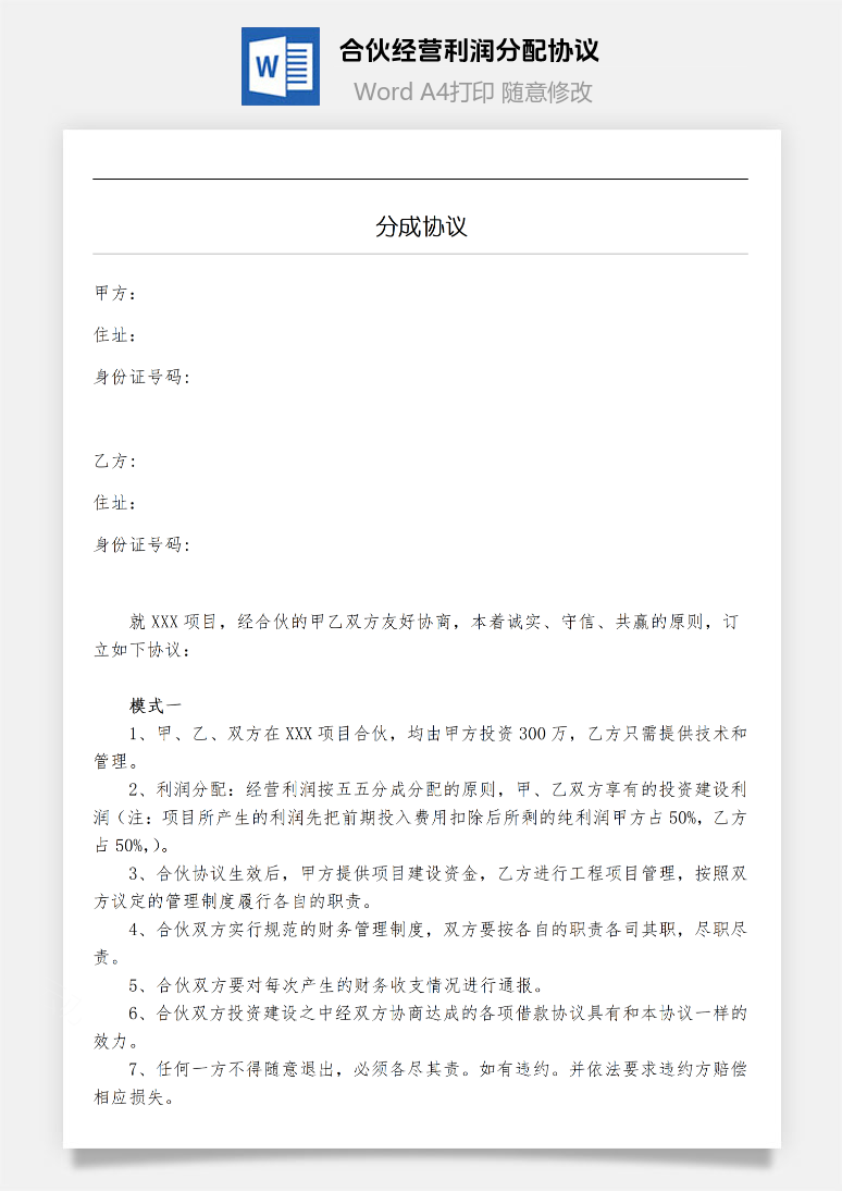 首页 Word模板 合同范本 合伙经营利润分配协议