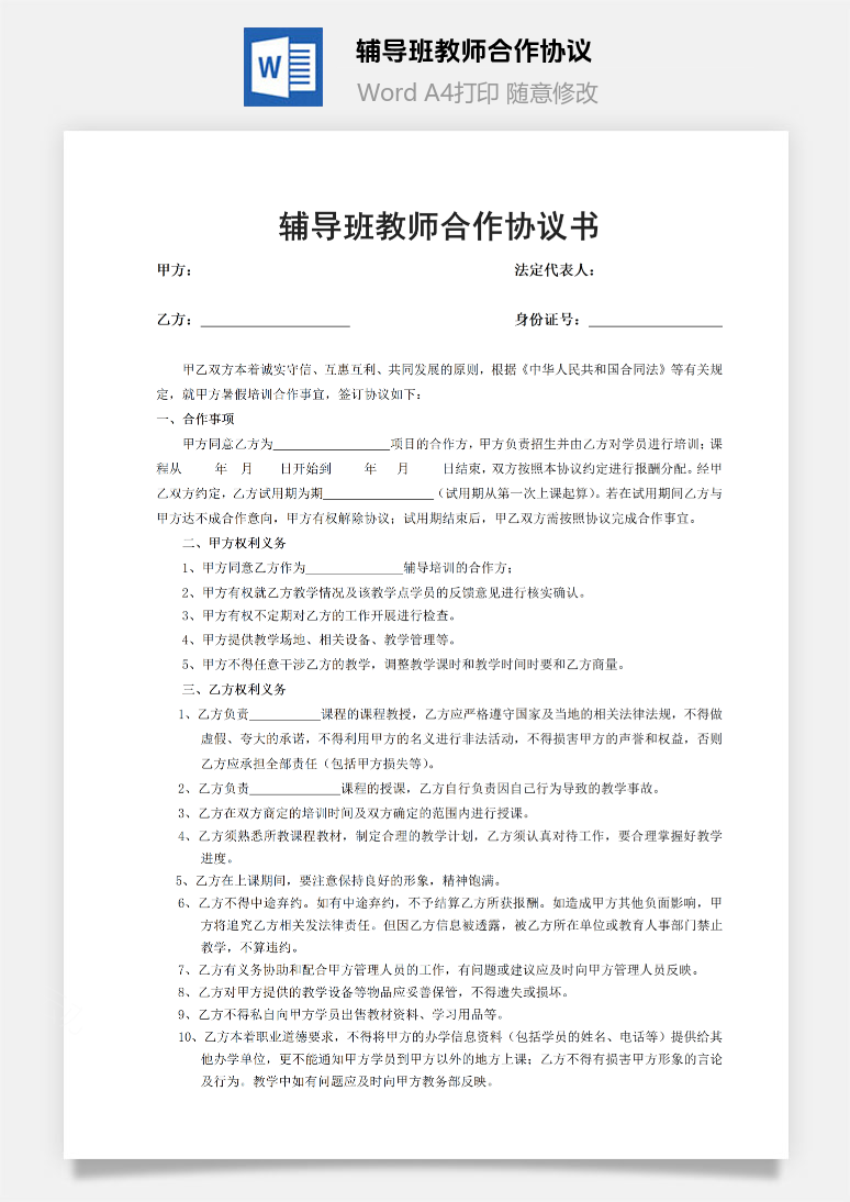 首页 Word模板 合同范本 辅导班教师合作协议书