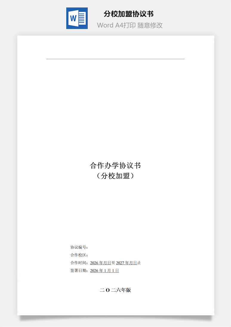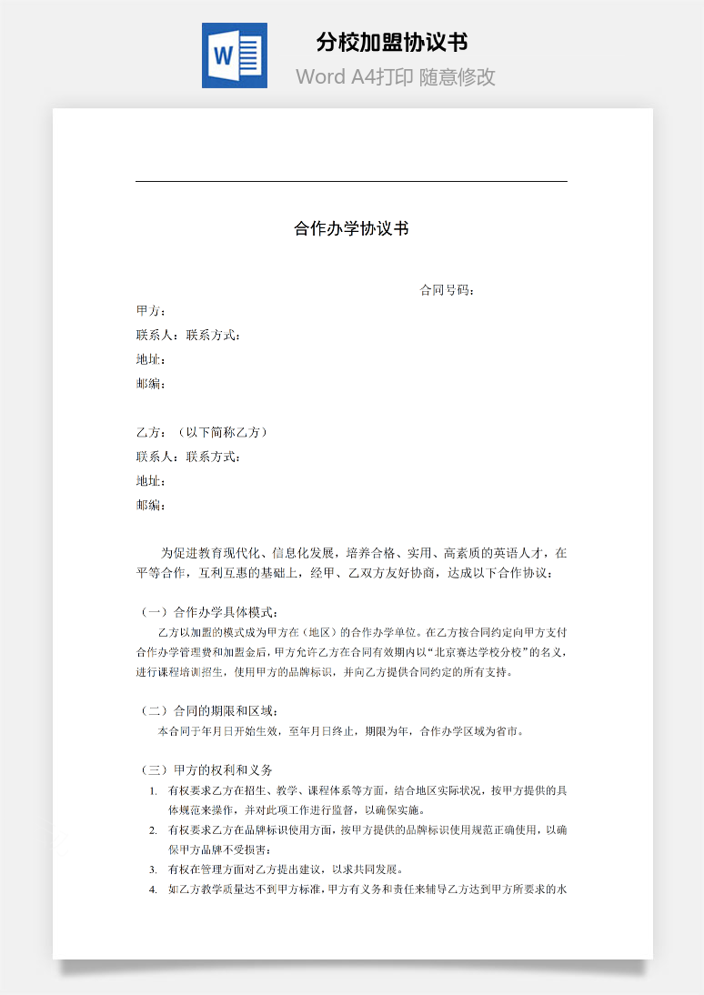 首页 Word模板 合同范本 合作办学协议书分校加盟版