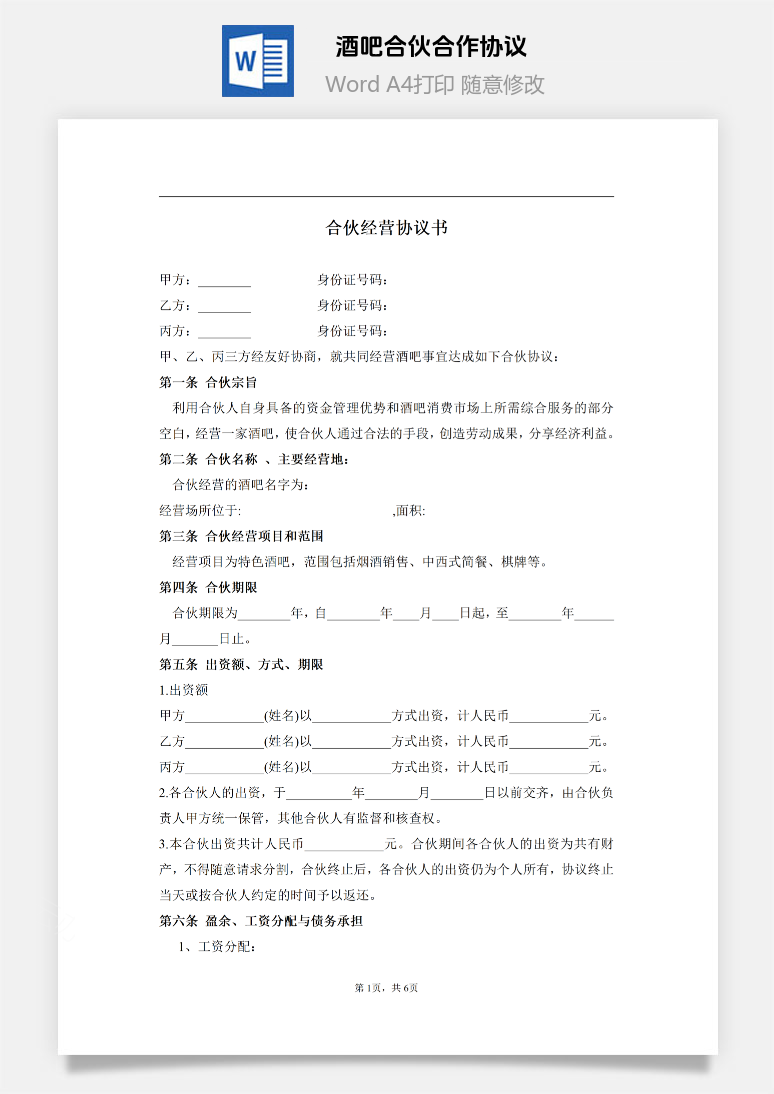 首页 Word模板 合同范本 酒吧合伙协议书