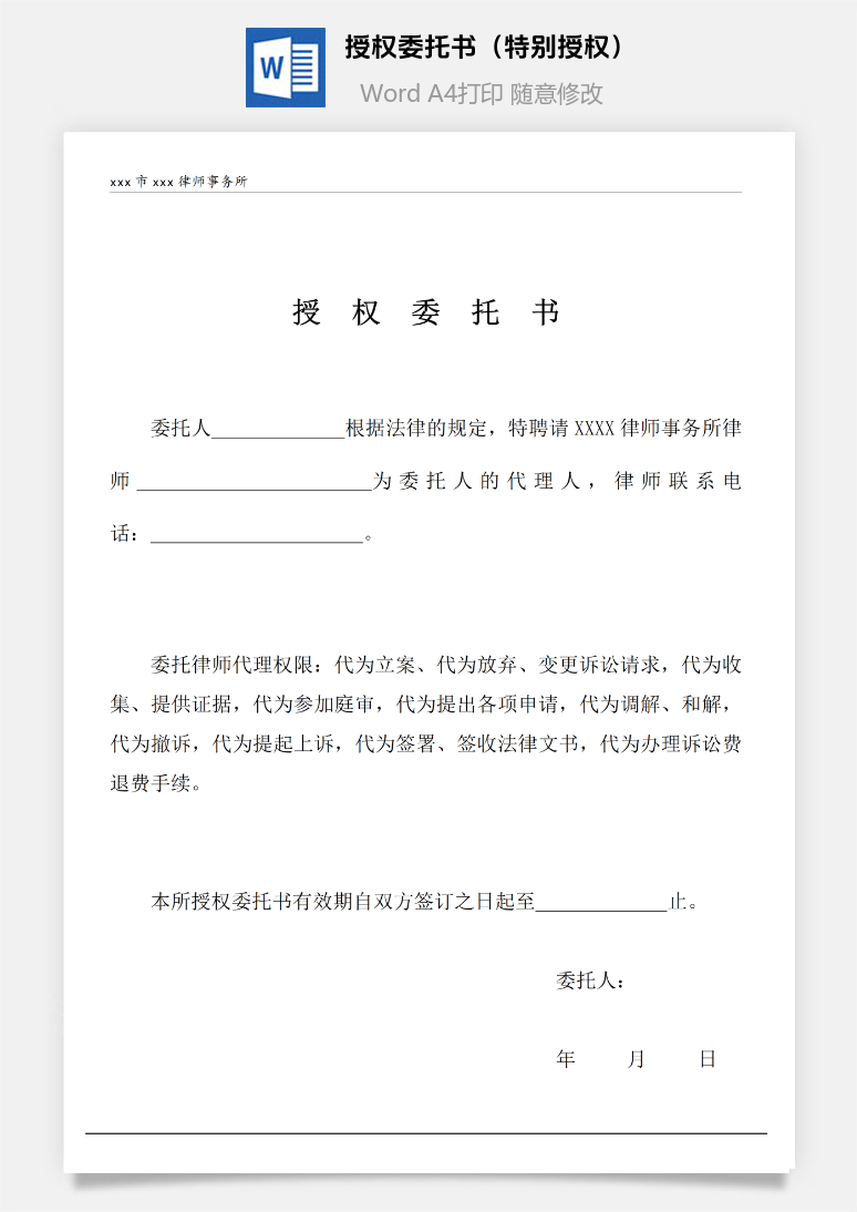 首页 Word模板 委托授权 民事授权委托书(特别授权)