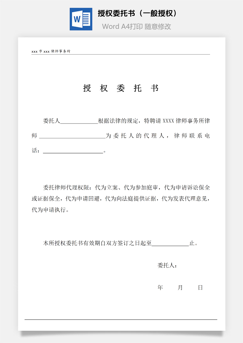 首页 Word模板 委托授权 民事授权委托书(一般授权)
